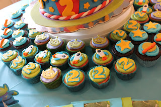 They look so much more exciting with bright, colorful frosting and fun cupcake liners! This is why it is okay to go with the simple designs, or fewer designs, to save lots of time! You can also embellish with frosting, like I did with orange frosting on the rockets and planets. I felt it needed some warmer colors to balance the red on the big cake. It adds a bit of pizzazz!So there you have it!
